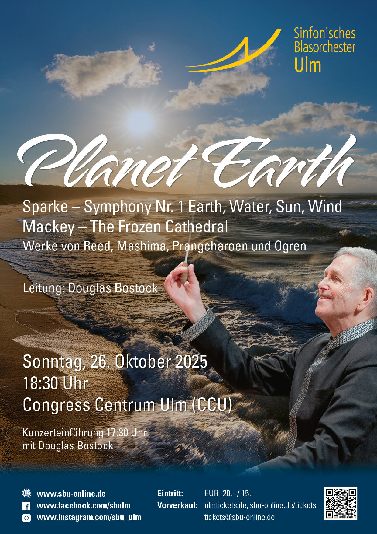 Das Sinfonische Blasorchester Ulm (SBU) lädt unter der Leitung von Douglas Bostock am Sonntag, den 26. Oktober 2025, um 18:30 Uhr zu seinem nächsten Konzert ins Congress Centrum Ulm (CCU) ein. Das Programm trägt den Titel Planet Earth und stellt unseren Planeten mit all seiner Schönheit, Vielfalt, aber auch Verletzlichkeit in den Mittelpunkt. Mit Werken von Philip Sparke, John Mackey, Narong Prangcharoen, Jayce John Ogren, Toshio Mashima, Alfred Reed. Konzerteinführung: 17:30 Uhr
