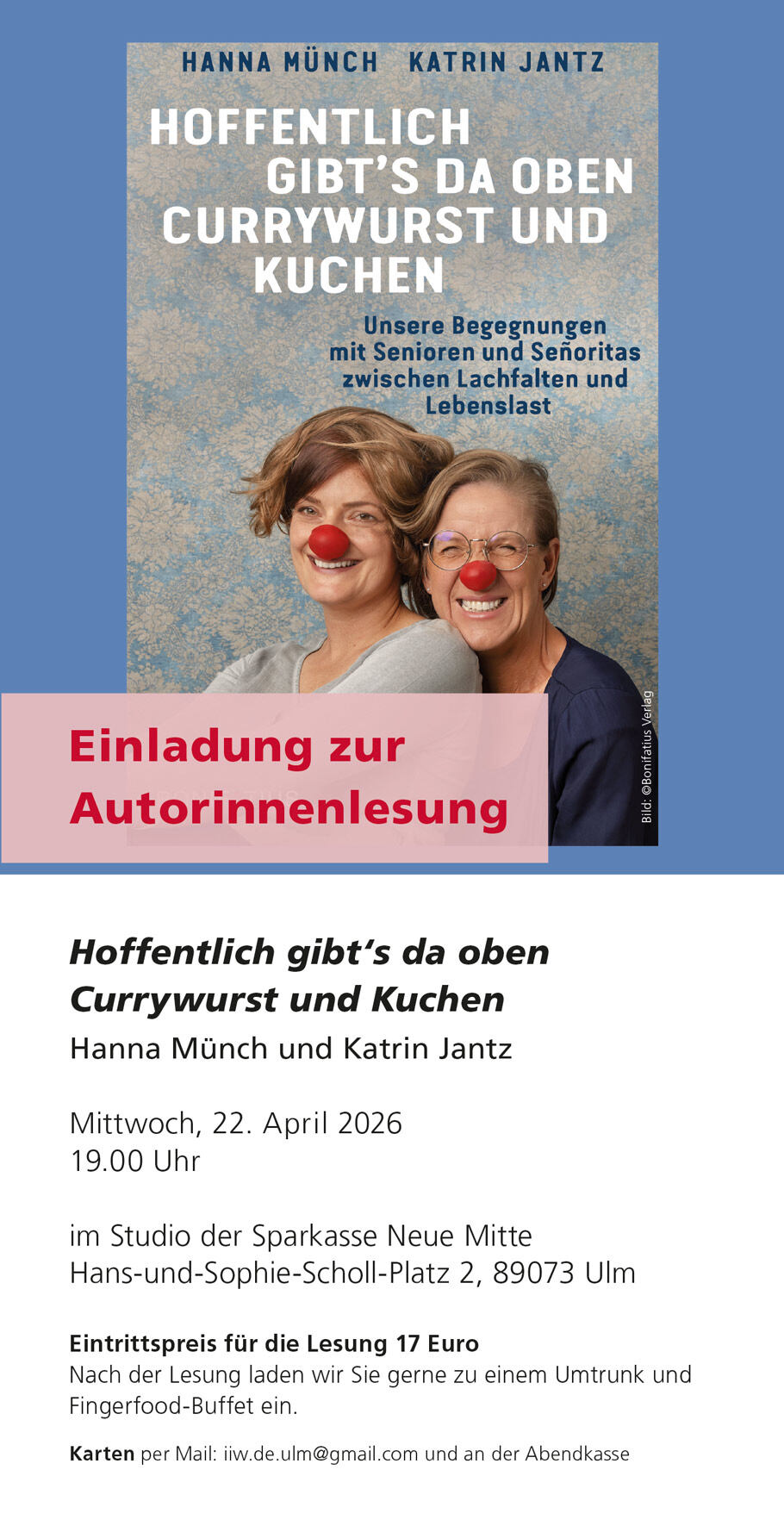 Eine humorvolle und berührende Reise durch das Leben bis zum Lebensende: Die Gesundheitsclowns Hanna Münch und Katrin Jantz erzählen von ihren Erlebnissen in Seniorenheimen, Hospizen und auf Palliativstationen. Aus besonders bewegenden Momenten entstand ein Buch, dessen Titel von einer 103-jährigen Dame stammt: „Hoffentlich gibt’s da oben Currywurst und Kuchen“. Die interaktive Lesung verbindet Lachen, Tiefgang und offenen Austausch über Leben, Tod und die Kraft des Humors.